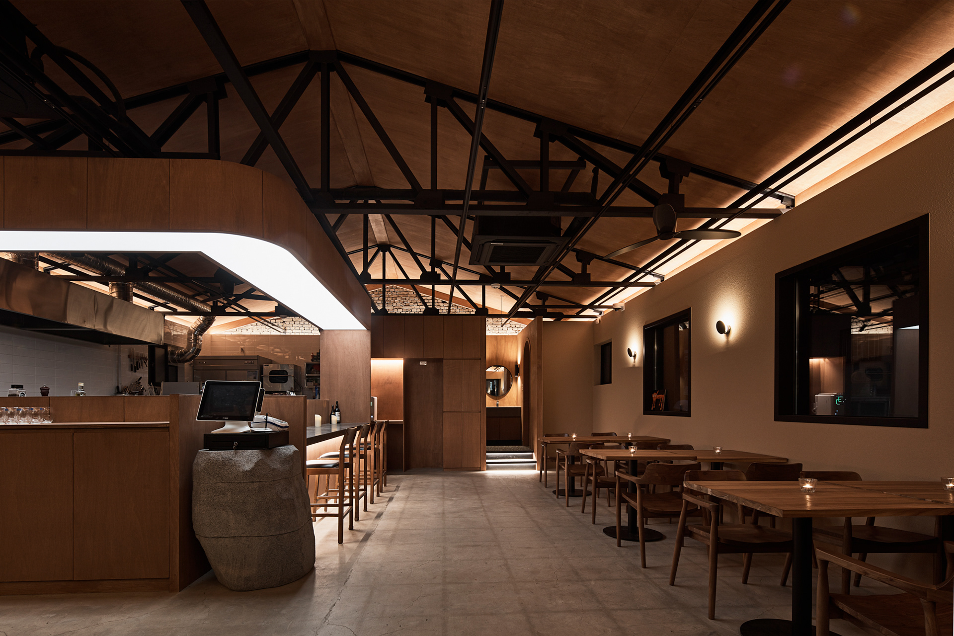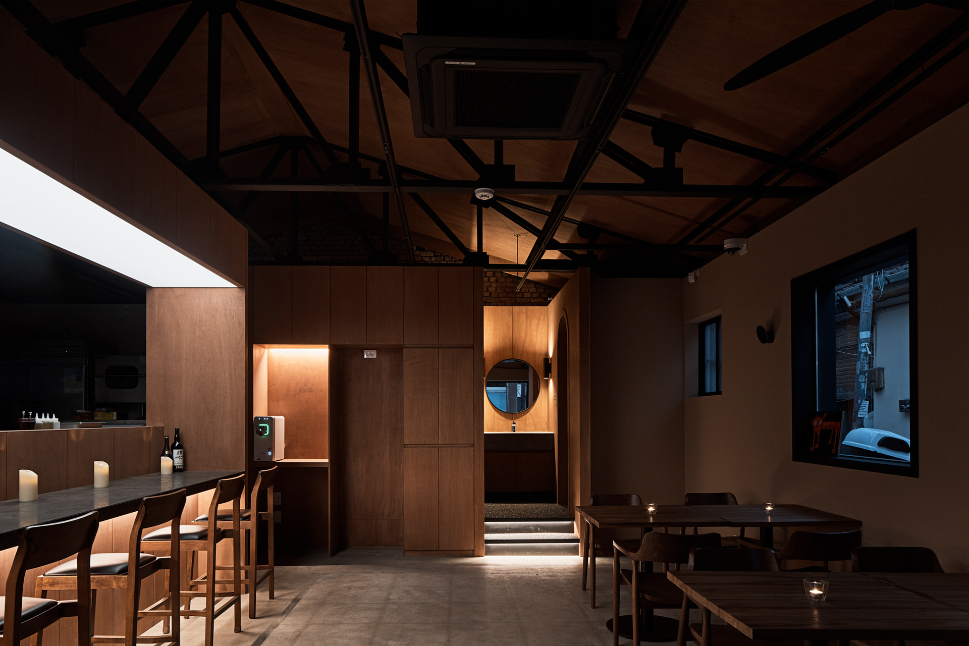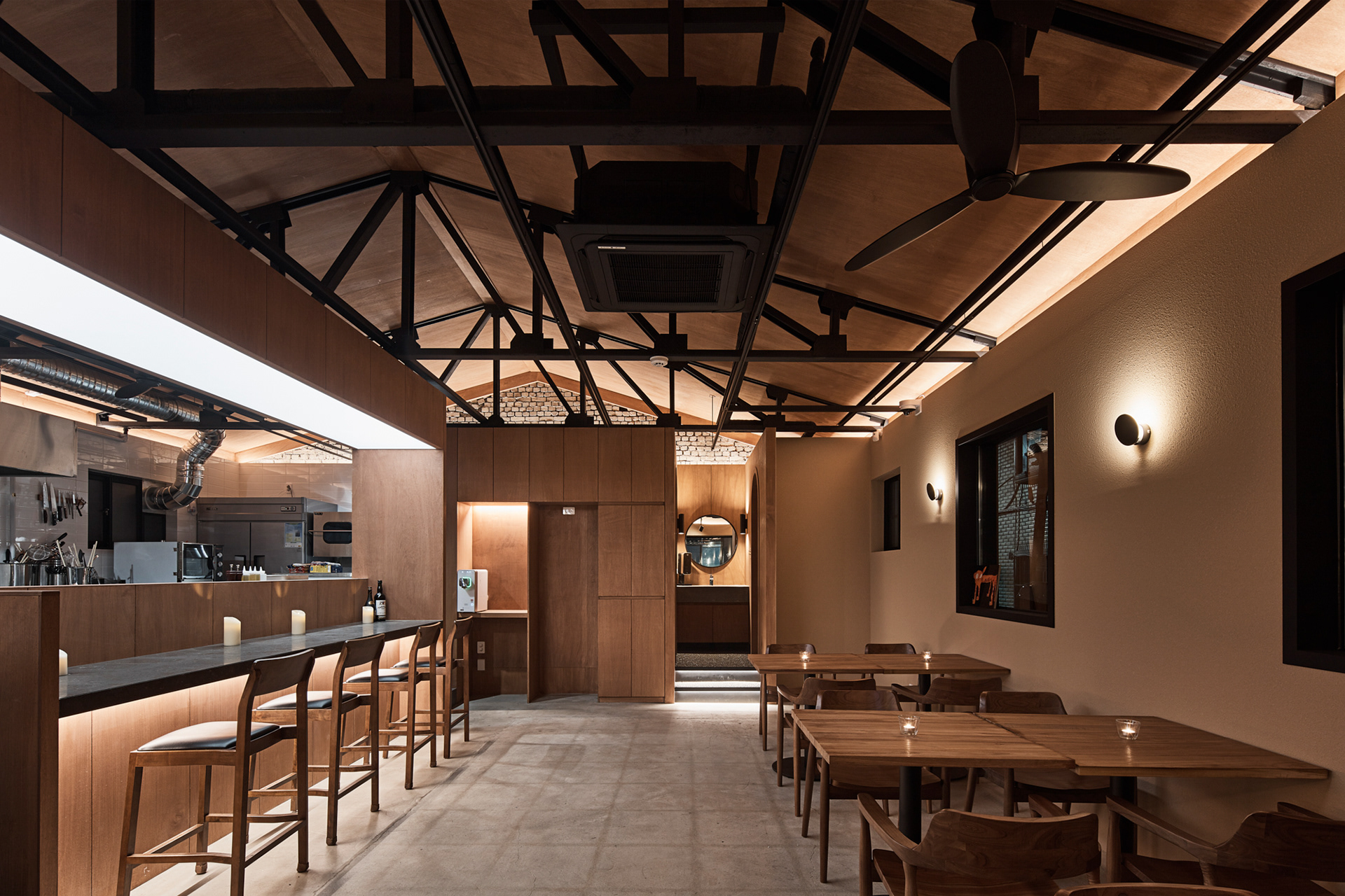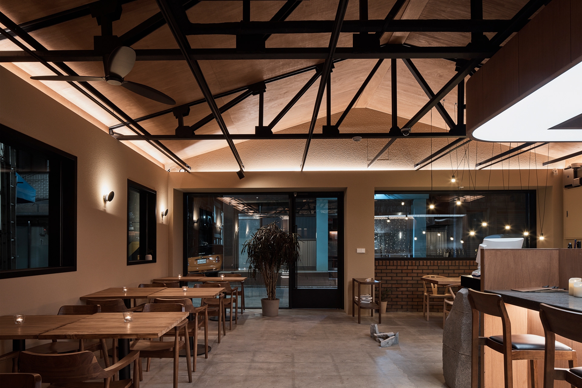 지역에 새로운 문화가 들어온다는 것은 낯선 일이지만 현재 건물의 자연스러움을 살리면서 어둑한 골목이 따듯한 빛으로 밝혀지는 상상을 해봤다.기존 건물이 가지고 있던 박공 지붕과 트러스 구조, 시멘트 벽돌로 만들어진 기존 벽의 일부 노출, 그에 맞는 로우(Raw)한 마감재를 선정하며 공간의 자연스러움을 살리고, 기능적인 작은 창들만 있던 기존 건물에서 많은 빛을 실내로 들이기 위해 더 큰 창문과 문을 만들었다. 폐쇄적이기보다는 외부와 연결 되는 것이 중요했다.