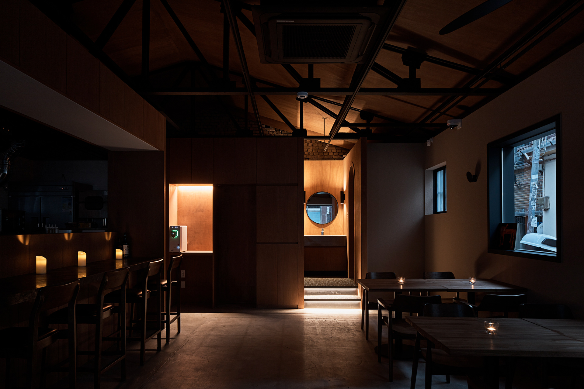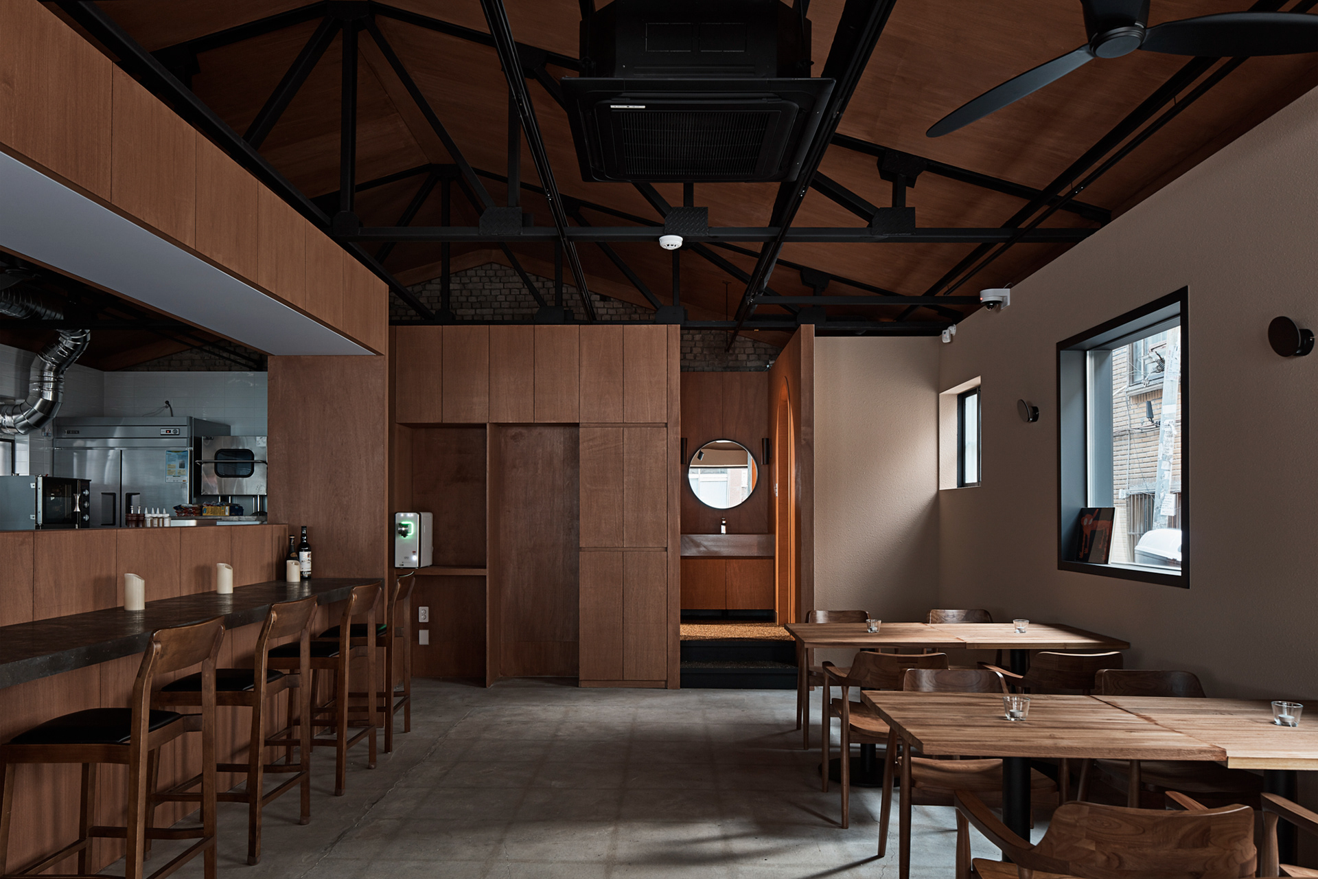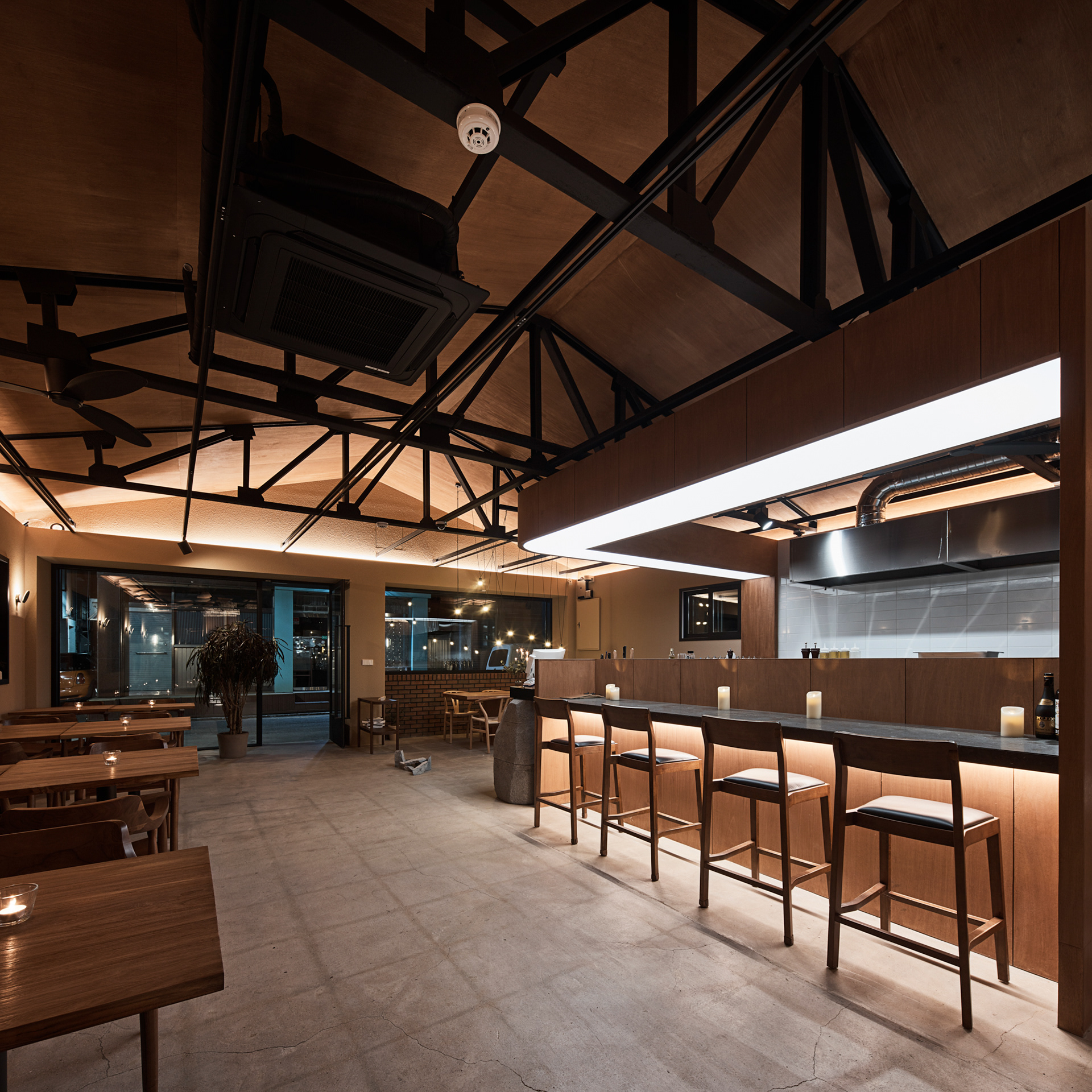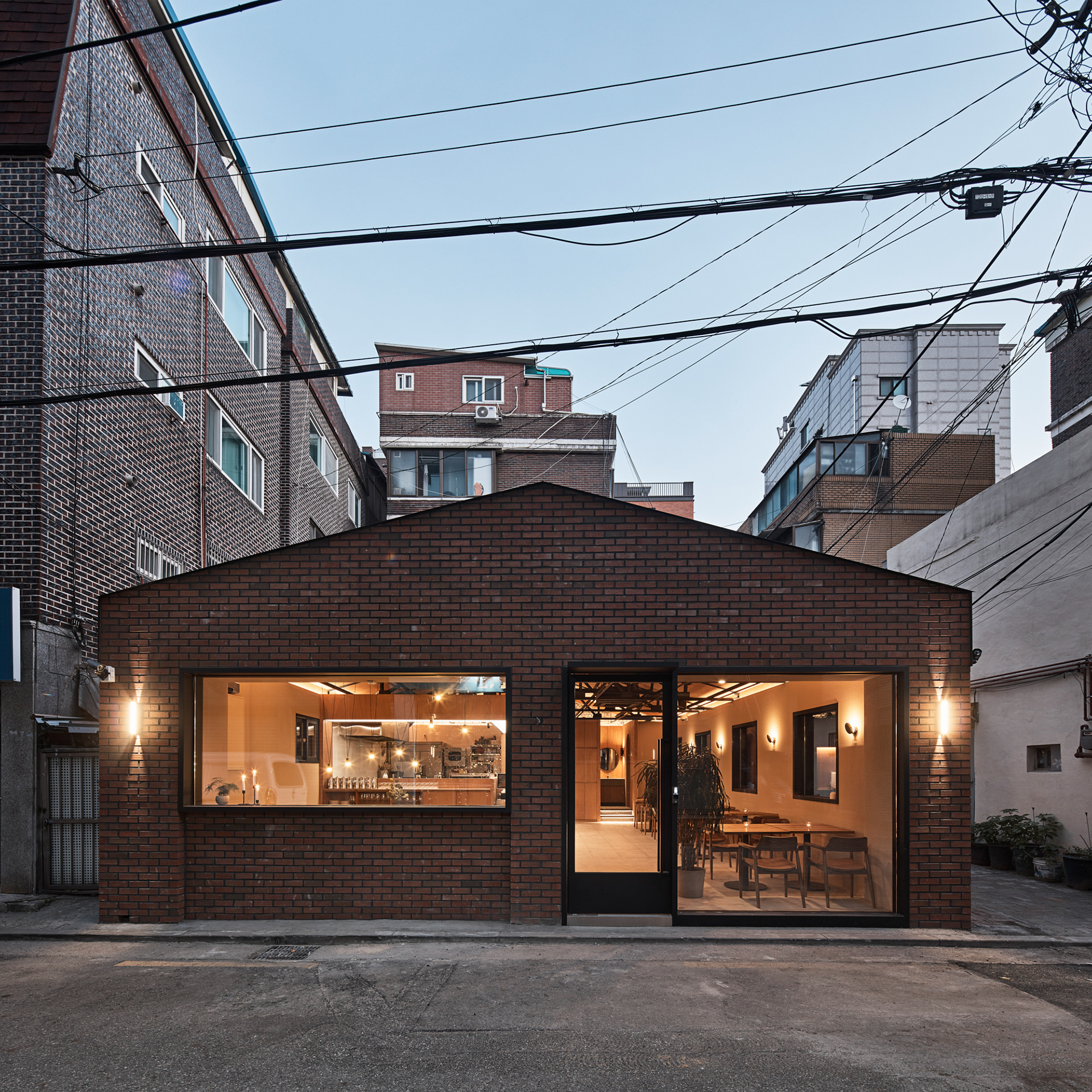 지역에 새로운 문화가 들어온다는 것은 낯선 일이지만 현재 건물의 자연스러움을 살리면서 어둑한 골목이 따듯한 빛으로 밝혀지는 상상을 해봤다.기존 건물이 가지고 있던 박공 지붕과 트러스 구조, 시멘트 벽돌로 만들어진 기존 벽의 일부 노출, 그에 맞는 로우(Raw)한 마감재를 선정하며 공간의 자연스러움을 살리고, 기능적인 작은 창들만 있던 기존 건물에서 많은 빛을 실내로 들이기 위해 더 큰 창문과 문을 만들었다. 폐쇄적이기보다는 외부와 연결 되는 것이 중요했다.