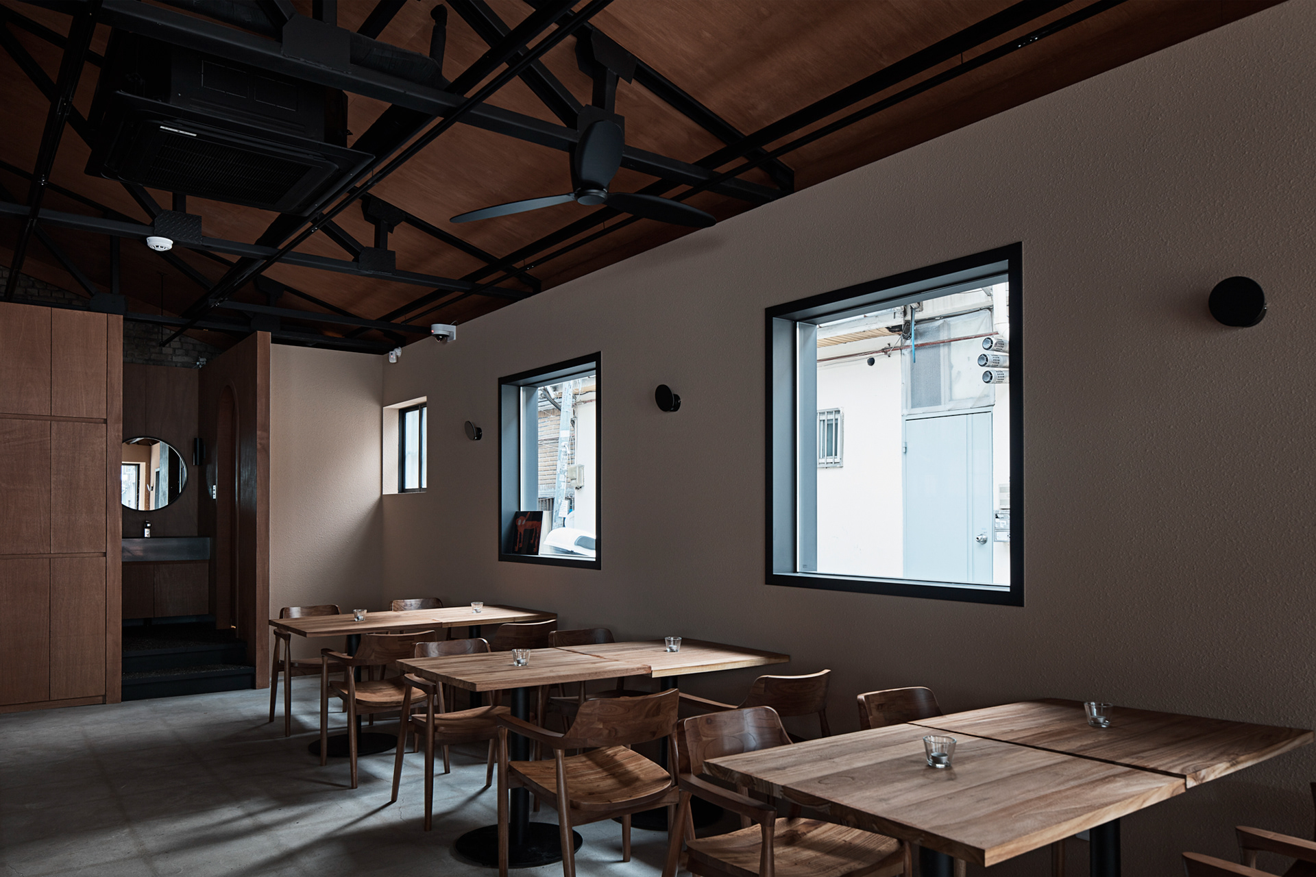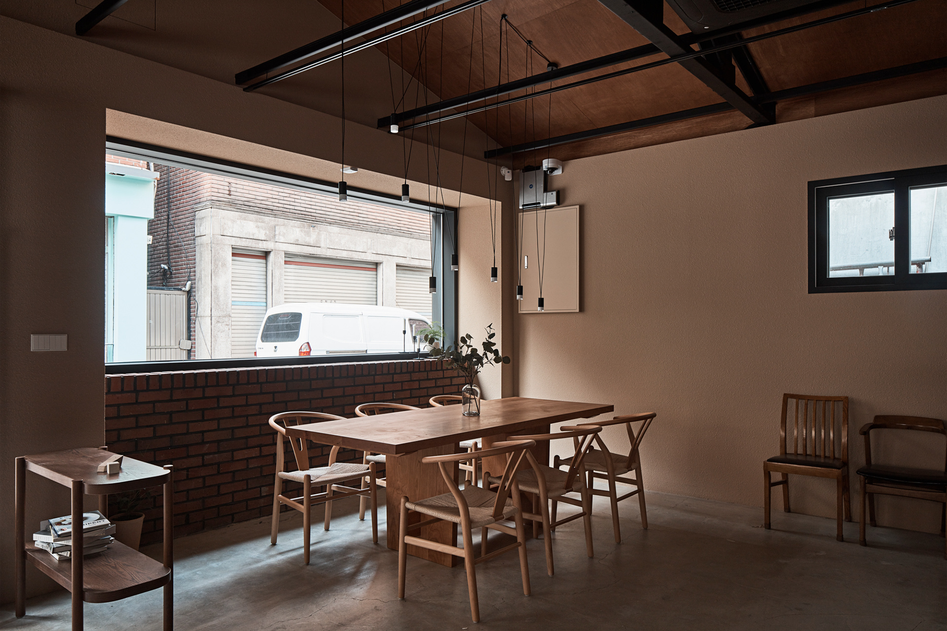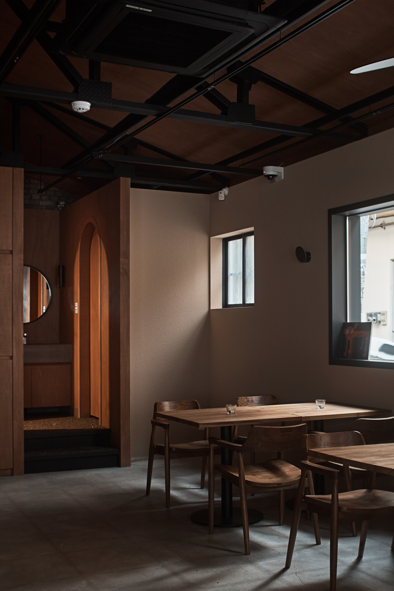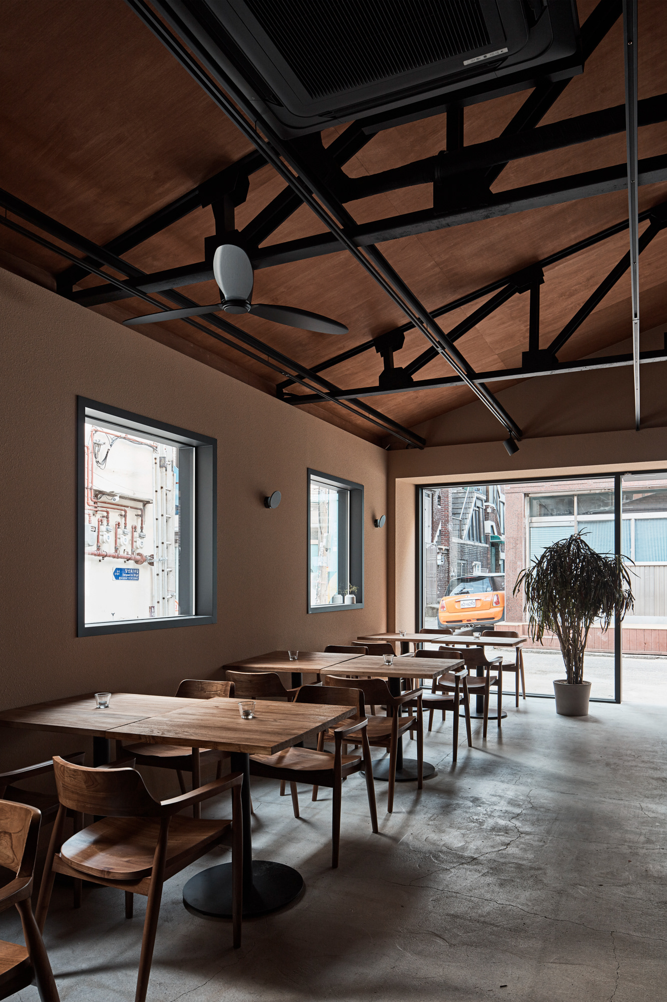 지역에 새로운 문화가 들어온다는 것은 낯선 일이지만 현재 건물의 자연스러움을 살리면서 어둑한 골목이 따듯한 빛으로 밝혀지는 상상을 해봤다.기존 건물이 가지고 있던 박공 지붕과 트러스 구조, 시멘트 벽돌로 만들어진 기존 벽의 일부 노출, 그에 맞는 로우(Raw)한 마감재를 선정하며 공간의 자연스러움을 살리고, 기능적인 작은 창들만 있던 기존 건물에서 많은 빛을 실내로 들이기 위해 더 큰 창문과 문을 만들었다. 폐쇄적이기보다는 외부와 연결 되는 것이 중요했다.