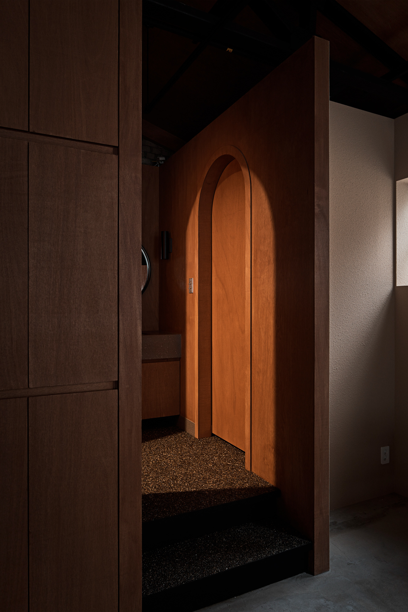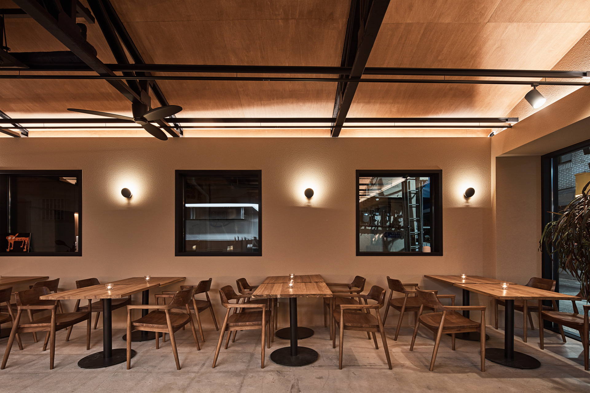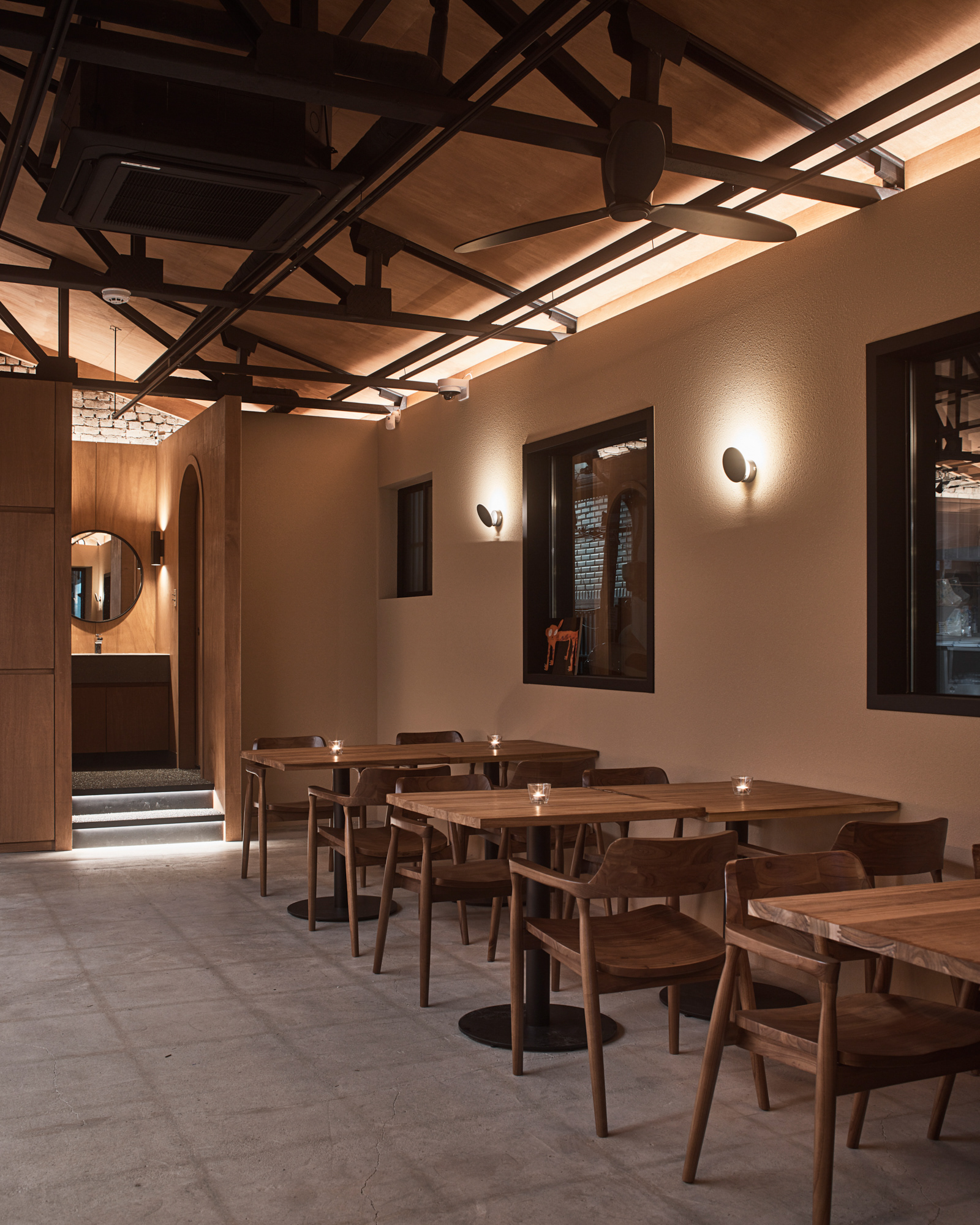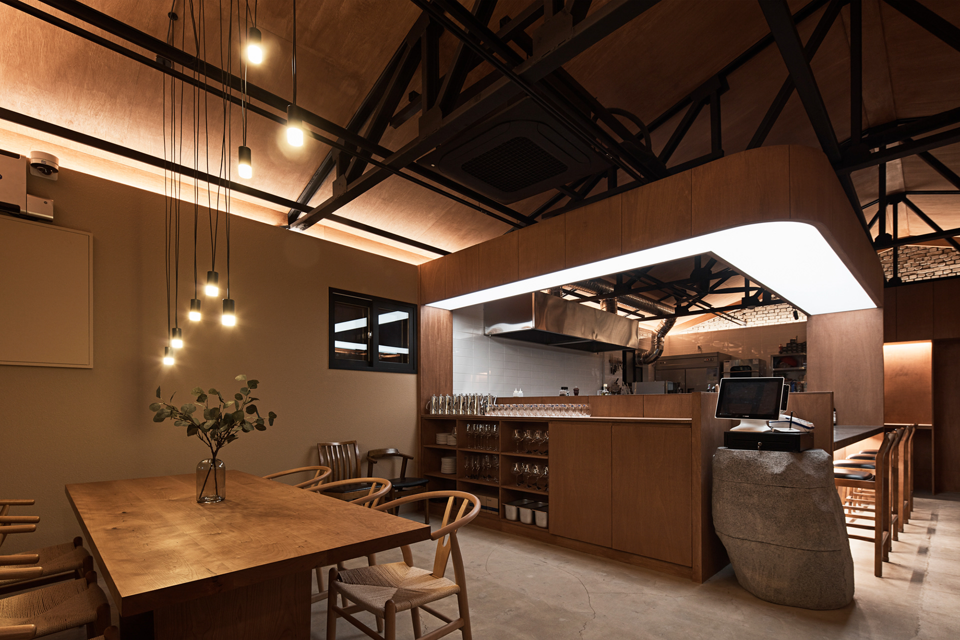 지역에 새로운 문화가 들어온다는 것은 낯선 일이지만 현재 건물의 자연스러움을 살리면서 어둑한 골목이 따듯한 빛으로 밝혀지는 상상을 해봤다.기존 건물이 가지고 있던 박공 지붕과 트러스 구조, 시멘트 벽돌로 만들어진 기존 벽의 일부 노출, 그에 맞는 로우(Raw)한 마감재를 선정하며 공간의 자연스러움을 살리고, 기능적인 작은 창들만 있던 기존 건물에서 많은 빛을 실내로 들이기 위해 더 큰 창문과 문을 만들었다. 폐쇄적이기보다는 외부와 연결 되는 것이 중요했다.