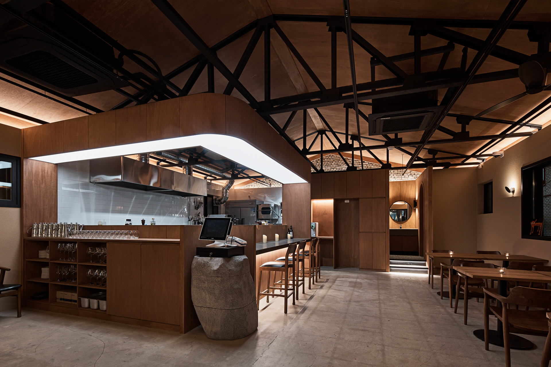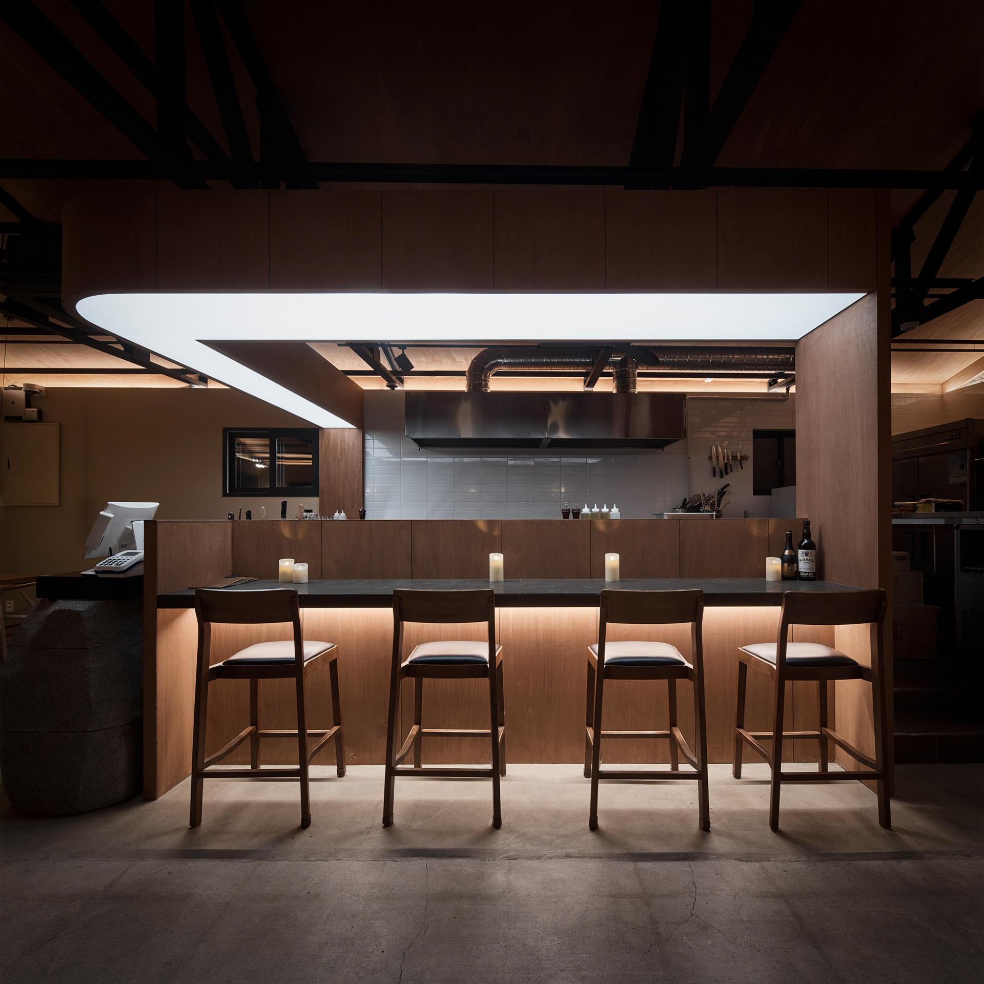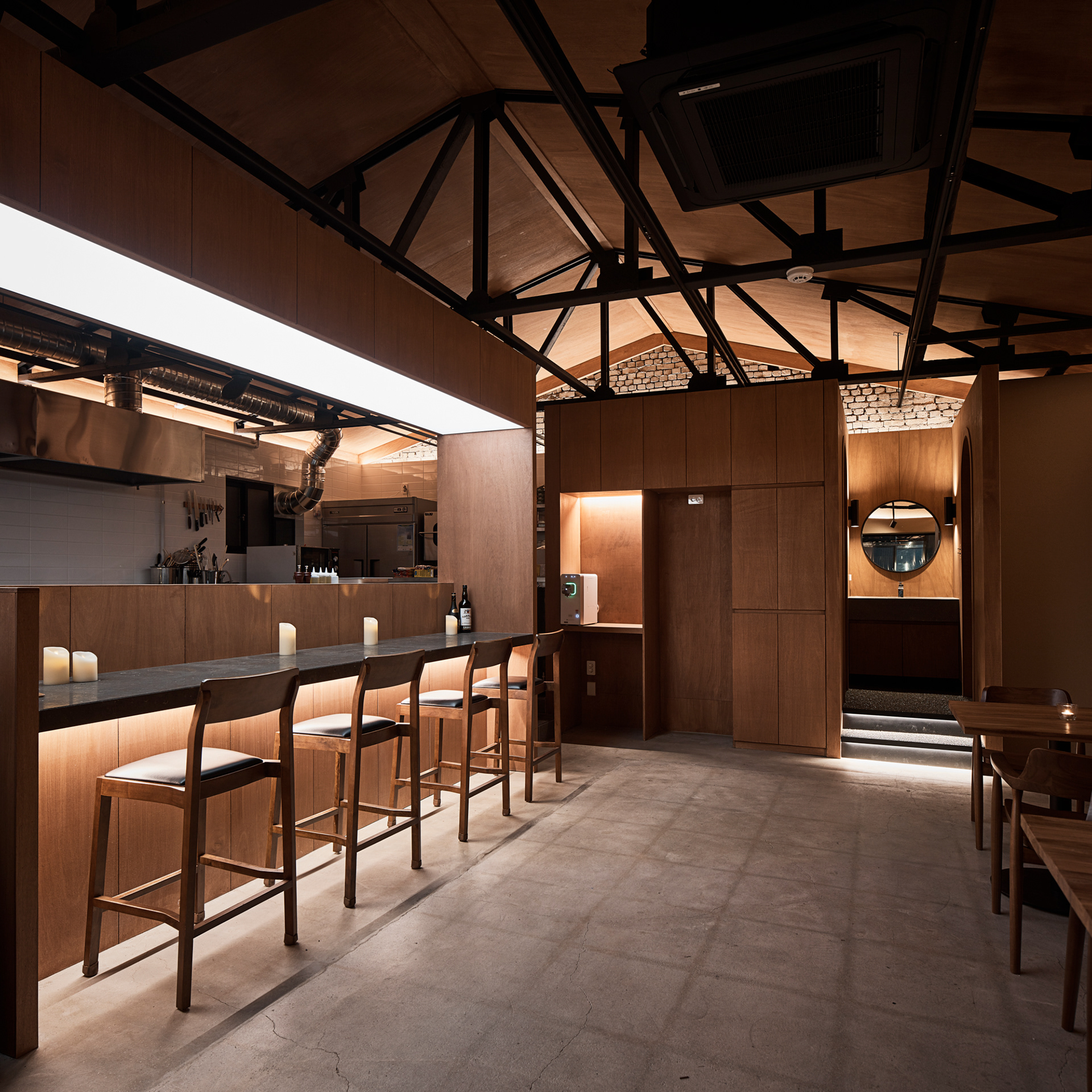 전체적으로 어두운 조도이지만 바리솔 조명을 이용하여 밝게 연출된 대면형의 오픈 주방은 홀보다 높은 레벨의 단 차이로 전체 공간에서 무대와 같은 역할을 한다. 특히, 특별한 벽이 없는 열린 공간의 평면 계획이었기에 소리의 어우러짐이 중요했다. 대면형 오픈 주방에서의 소리, 전체 분위기를 위한 음악 소리, 사람들의 대화 소리, 식기류 등의 사물들이 부딪혀서 나는 소리가 불편한 소음이 되지 않기를 바라며 좌석 배치를 고려하여 스피커의 위치와 방향 등을 계획하였다. 그리고 작지만 잘 갖춰진 분리된 파우더룸과 화장실에서는 또 다른 소리를 통해 이 모든 것과 잠시 다른 공간을 경험하게 한다.