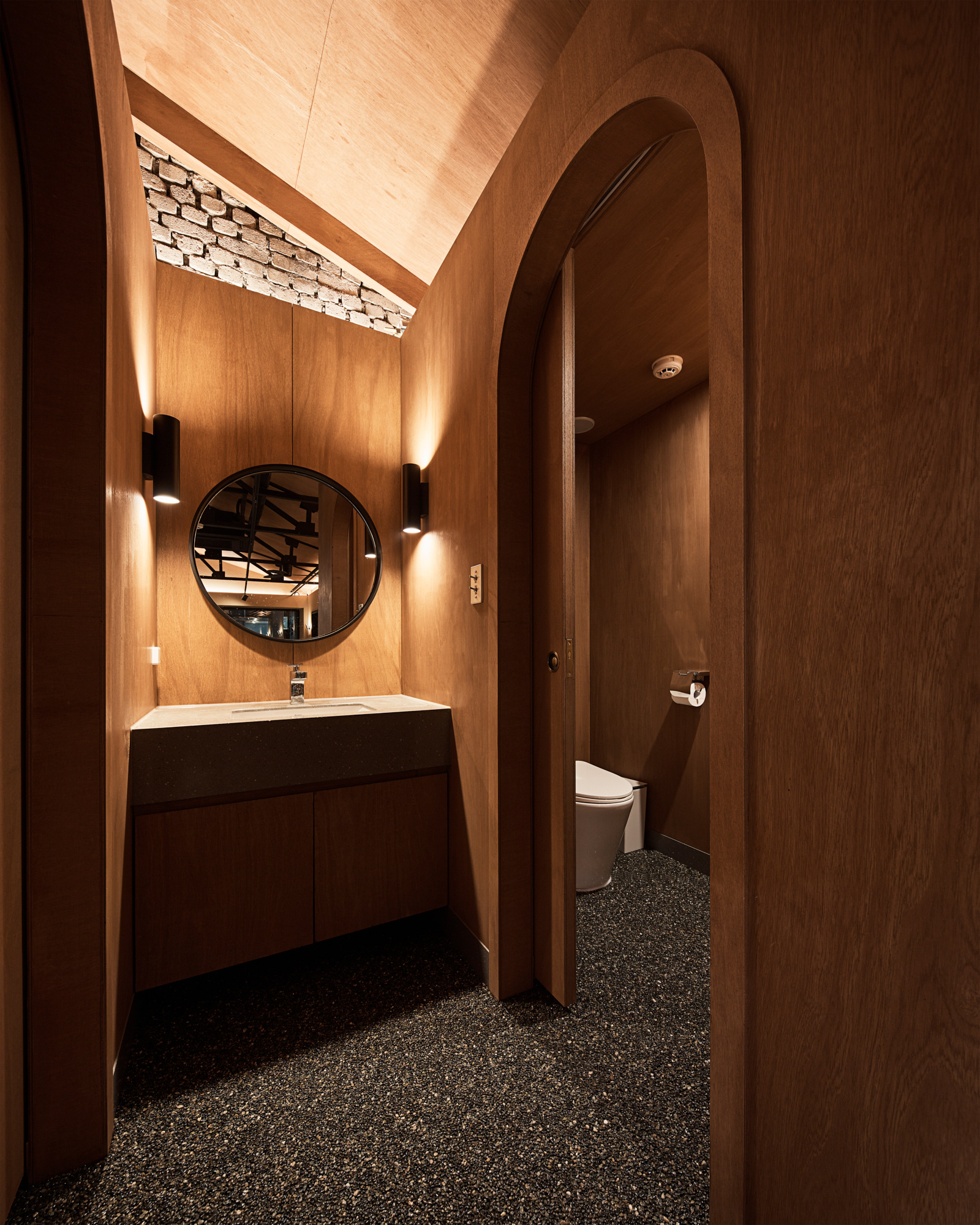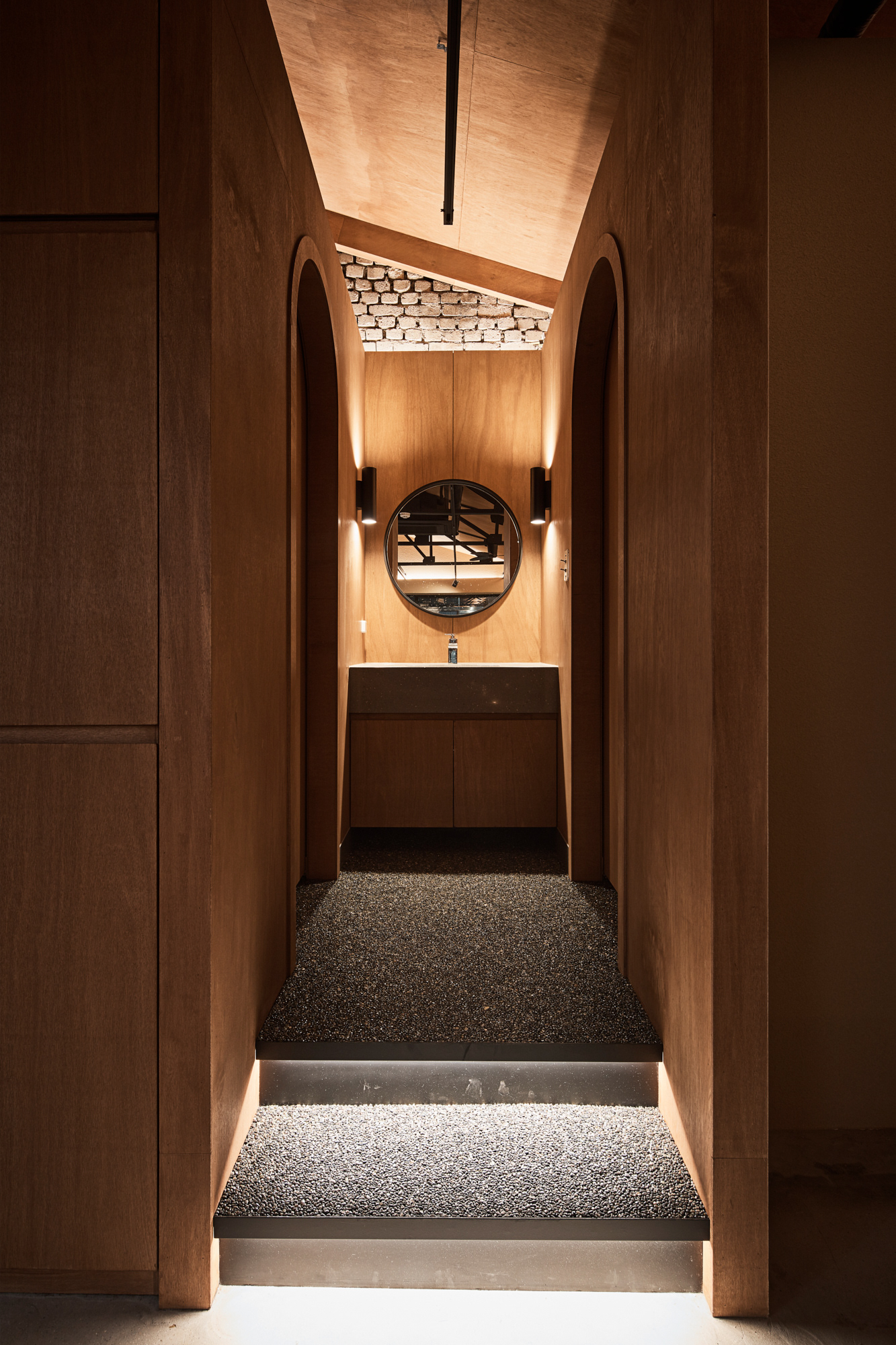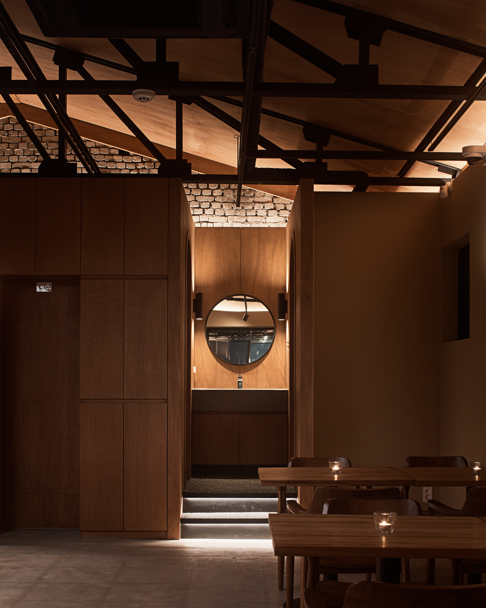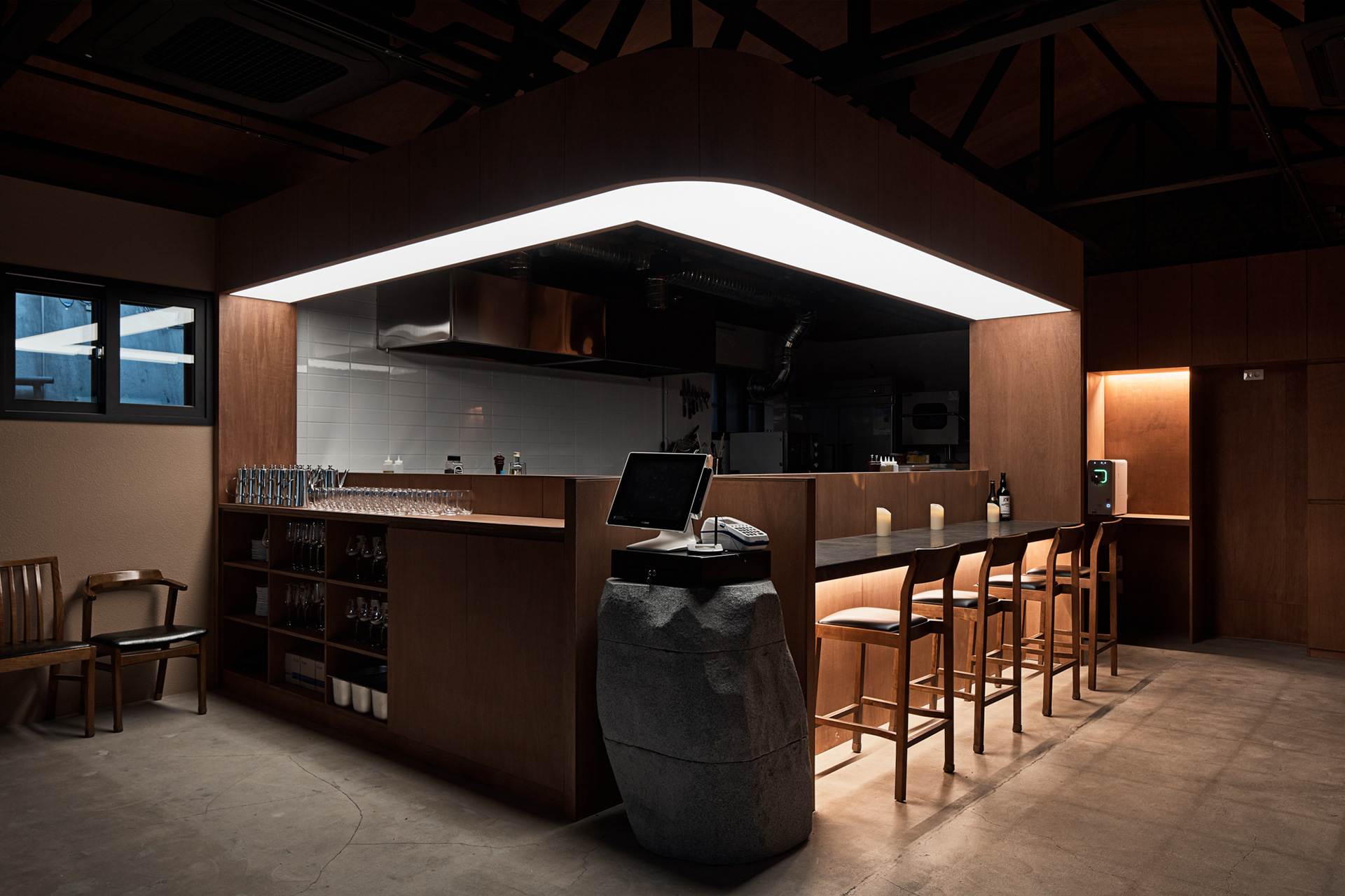 전체적으로 어두운 조도이지만 바리솔 조명을 이용하여 밝게 연출된 대면형의 오픈 주방은 홀보다 높은 레벨의 단 차이로 전체 공간에서 무대와 같은 역할을 한다. 특히, 특별한 벽이 없는 열린 공간의 평면 계획이었기에 소리의 어우러짐이 중요했다. 대면형 오픈 주방에서의 소리, 전체 분위기를 위한 음악 소리, 사람들의 대화 소리, 식기류 등의 사물들이 부딪혀서 나는 소리가 불편한 소음이 되지 않기를 바라며 좌석 배치를 고려하여 스피커의 위치와 방향 등을 계획하였다. 그리고 작지만 잘 갖춰진 분리된 파우더룸과 화장실에서는 또 다른 소리를 통해 이 모든 것과 잠시 다른 공간을 경험하게 한다.